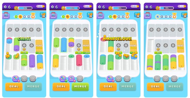 市场表现:8月美国市场双端累计收入126万美元核心玩法:游戏基础玩法类似“水排序”,但在此基础上个进行了创新。游戏中的道具是硬币,硬币有面值差异,玩家需要将相同面值的硬币放在一起,并进行合成,合成后变为高级硬币,可以继续与高级硬币继续合成。若场上硬币数量不够,可以直接召唤新的硬币,游戏可以持续游玩。美术风格&题材:金币、现代