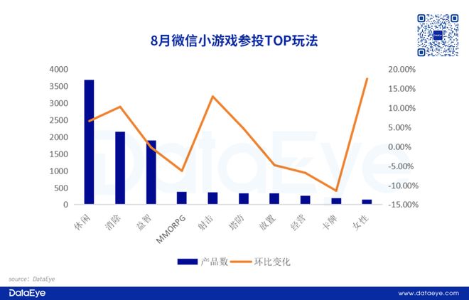 在8月参投微信小游戏玩法TOP10分类中,休闲排名TOP玩法第一,消除排名第二,益智类排名第三。整体来看,MMORPG、放置、经营和卡牌品类环比下滑,而女性向品类则增长明显。