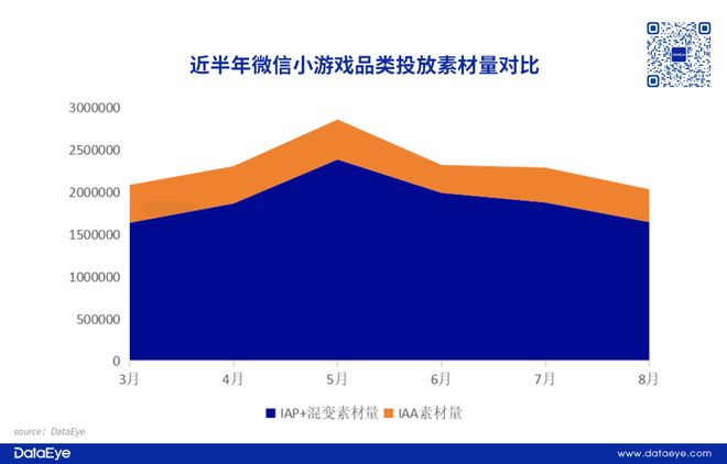 素材量 方面,DataEye-ADX投放数据显示,8月微信小游戏投放素材量 (图片+视频)约为203万,环比7月下滑11.2%。8月小游戏市场进入暑期档尾期,部分厂商逐渐降低素材投放量。从降幅来看,IAP+混变游戏相关素材下滑超过12%。