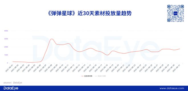 4399《弹弹星球》排名月度消耗榜第6名,消耗增长明显,主要原因是同类型竞品第七大道《新弹弹堂》具备先发和IP加持优势,《弹弹星球》作为后发产品,项目组需要思考如何快速抢量。DataEye-ADX投放数据显示,《弹弹星球》在上榜前两天突然提升投放量,单日投放素材数升至1400条,而次日达到投放数量峰值,单日接近3000条。