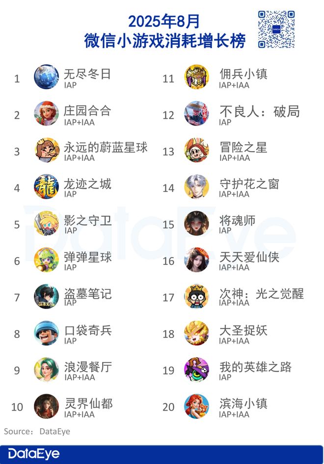 8 月 消耗增长榜中,《无尽冬日》在8月增长突出,排名月增长第一,并在月度消耗榜层面上超过同类型竞品《三国:冰河时代》。除此之外,《庄园合合》和《永远的蔚蓝星球》排名月度消耗增长第二、三名,同时也顺利进入月度消耗榜TOP20。