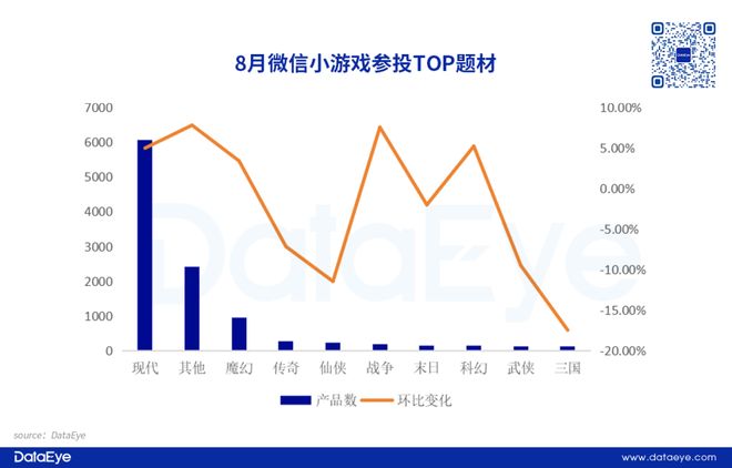 参投微信小游戏题材TOP10分类中,现代、其他、魔幻排名前三。8月战争题材游戏数增长最多,环比提升接近10%。仙侠和三国题材是热投题材TOP10中降幅最多的题材,传统题材持续疲软。