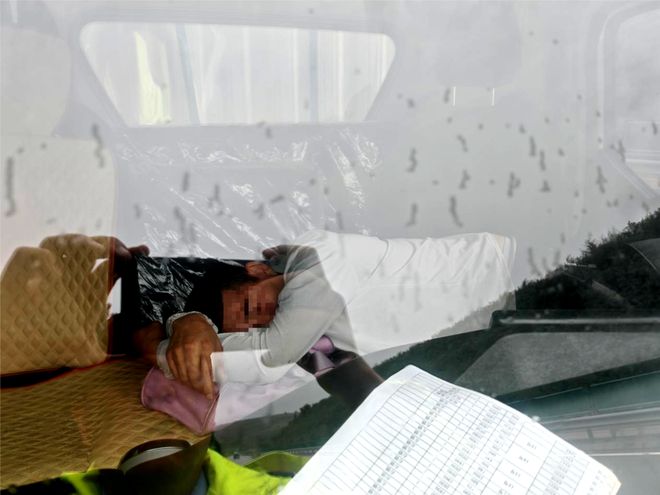 正当民警准备寻找该车驾驶人时,却发现该车驾驶人正在驾驶室内睡觉,根本没有察觉到民警的到来,于是民警轻敲车窗,驾驶人才猛然醒来,经民警询问,该车行驶至事发路段时,车辆仪表盘的故障灯突然亮起,在司机求助询问维修工后,维修工称将车辆停一段时间后再重启,可能会恢复正常,于是该车驾驶人将车停在应急车道后准备等待一段时间后继续行驶,并未在故障车辆后方设置三角警示标志,驾驶人本人也未转移至护栏外,而是选择在车内睡觉。